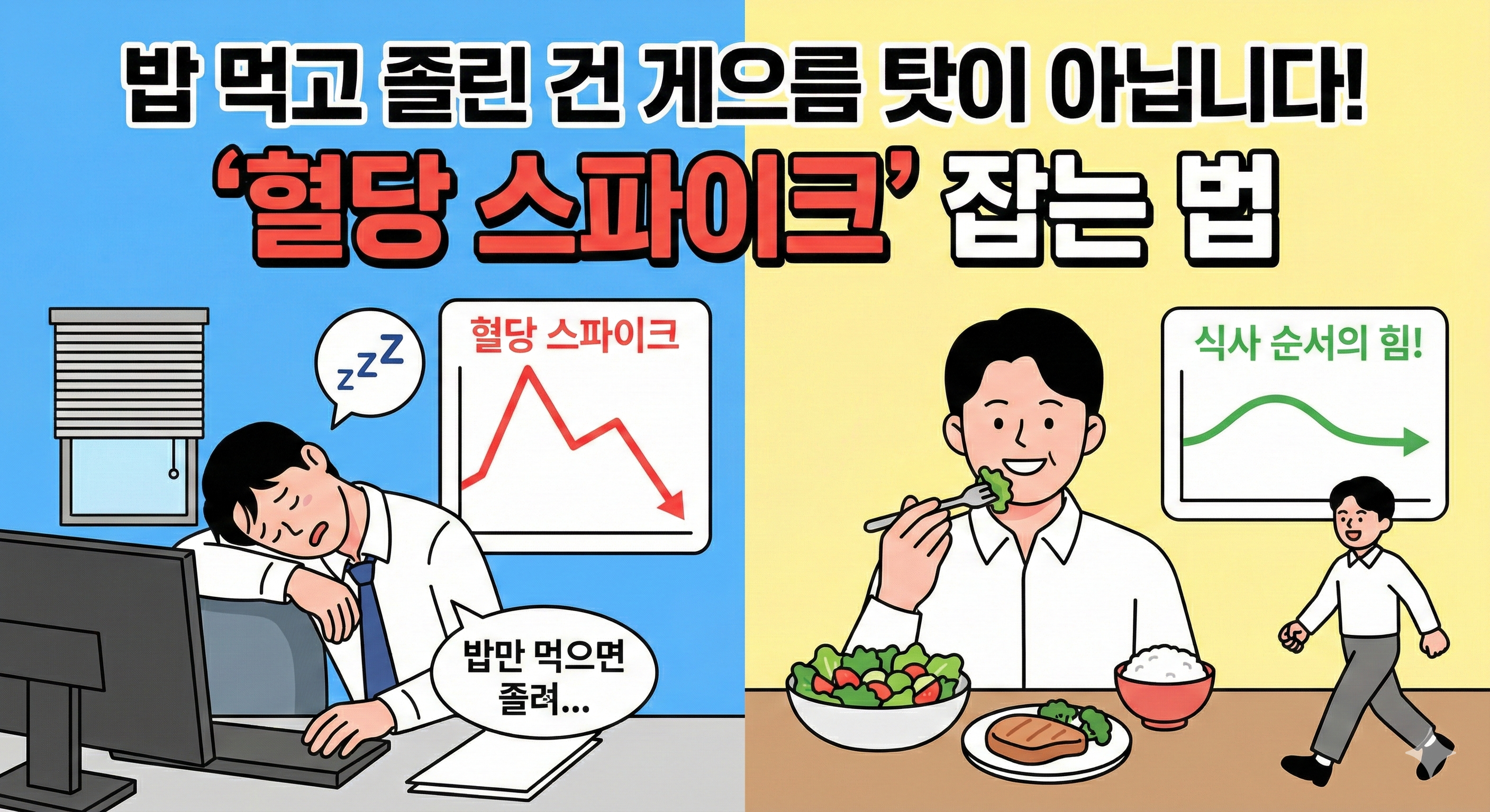 식후 졸음은 몸이 보내는 경고 신호! 채소부터 먹는 습관 하나로 혈당 스파이크를 막고 활력을 되찾으세요.